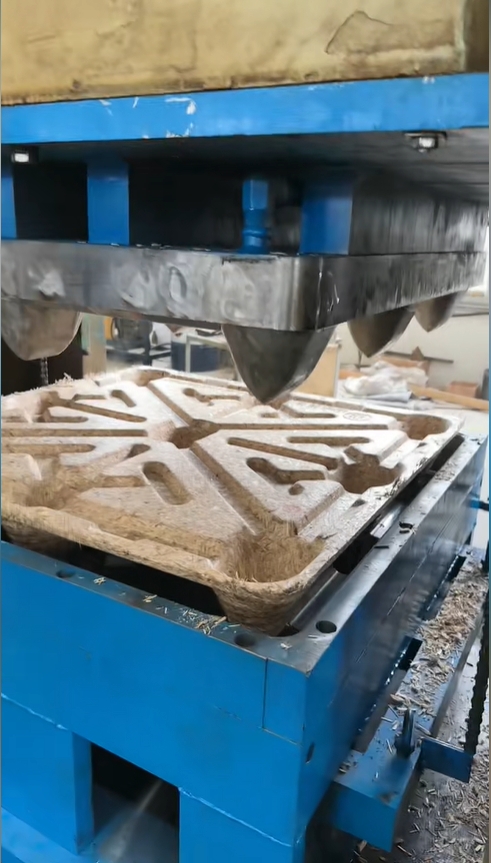 (8)經模壓木屑托盤液壓機(2500噸四柱/框架壓力機)高溫高壓處理,一次模壓成型;